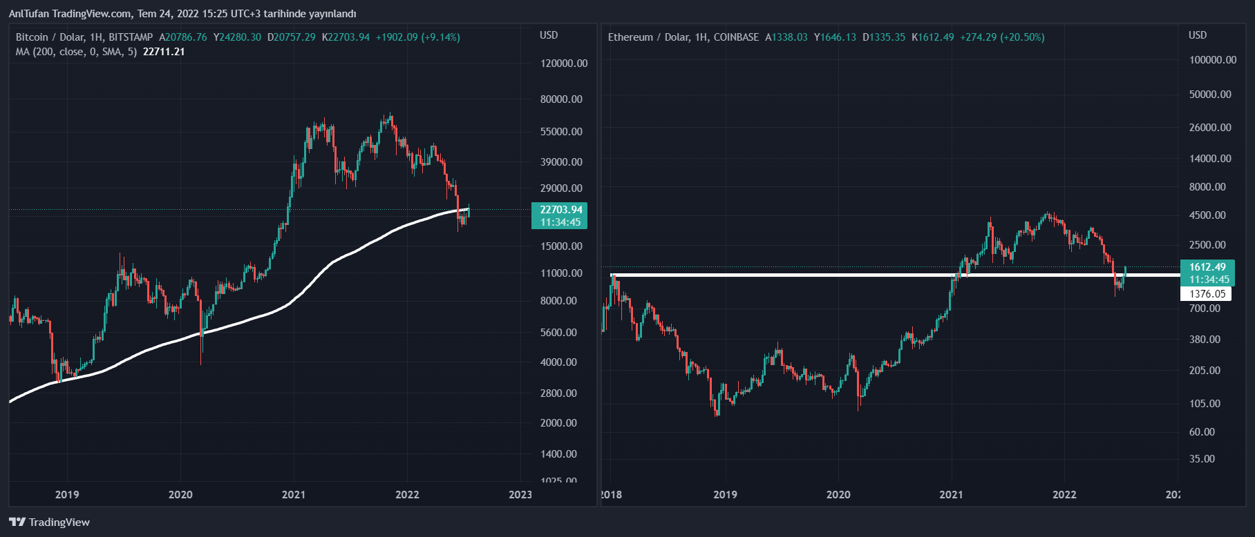 Kritik bir destek seviyesi olan 22 bin dolardan tekrardan tepki almayı başaran BTC, ayıların satıcı baskısını bir nebze de olsa kırmayı başardı.