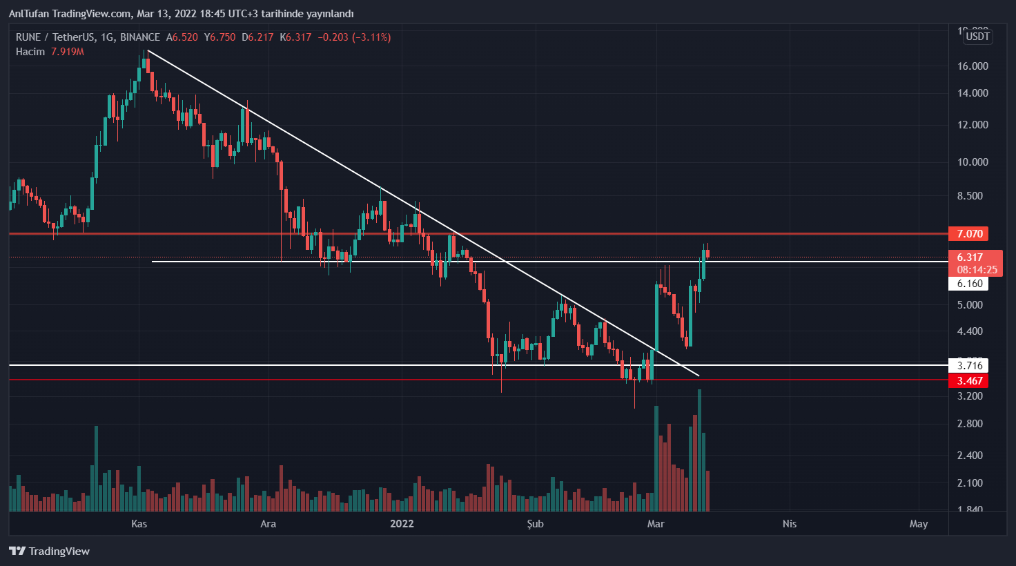 Kritik 7 dolar direnç seviyesine yaklaşan RUNE, bu seviyenin aşılmasıyla birlikte yükselişine devam edebileceği gibi bu seviyeden bir reddedilme yaşama durumunda ise 5 dolar seviyelerine kadar bir geri çekilme yaşayabilir.
