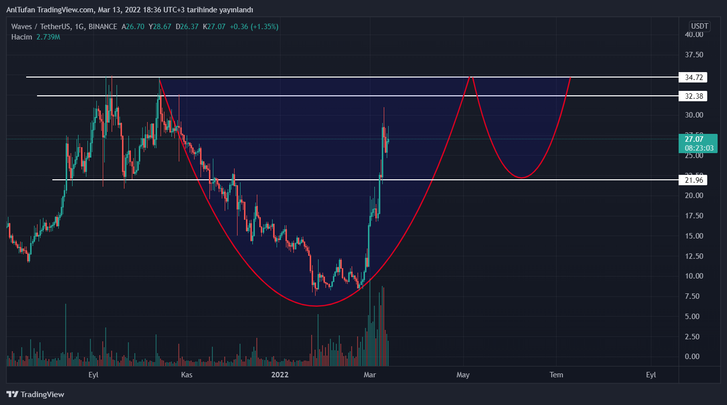 İlerleyen günlerde yaşayacağı yükseliş ve geri çekilmelerin ardından bir çanak kulp formasyonu oluşturabilecek olan Waves, 32 – 35 dolar formasyon kırılımıyla birlikte çok daha sert yükselebilir.