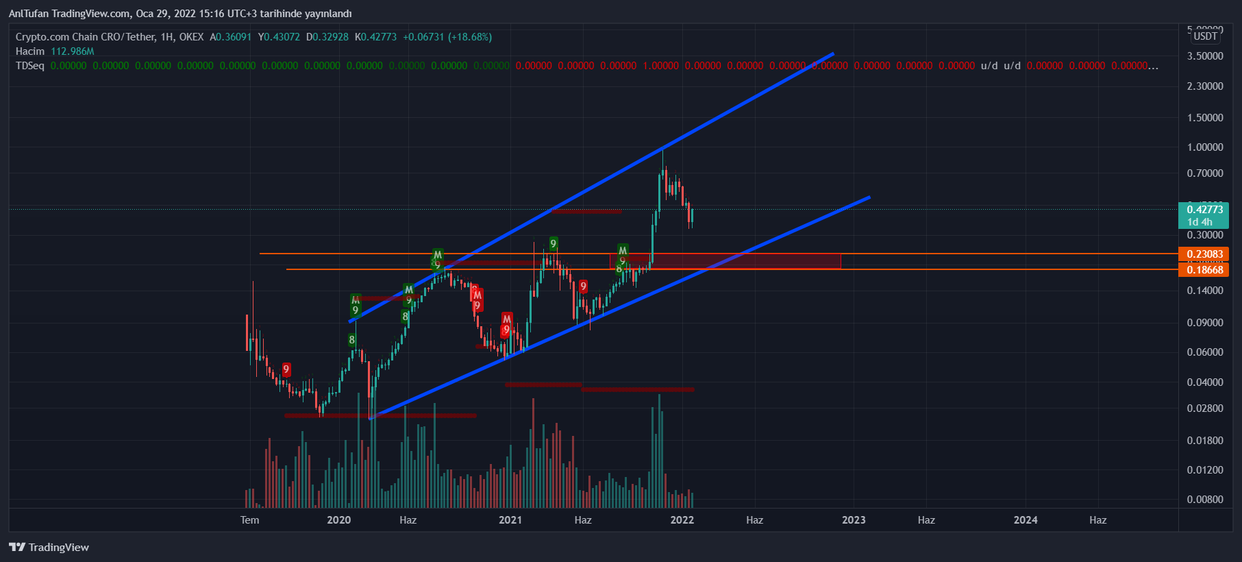 Kripto para borsaları arasında oldukça popüler olan Crypto.com’un yerel tokeni CRO bu hafta yatırımcılarına güzel kazançlar getirmiş durumda. Uzun vadeli grafiğimize baktığımızda ilk gözümüze çarpan yükselen bir ayrık kanalının net bir şekilde görülmesi göze çarpıyor.