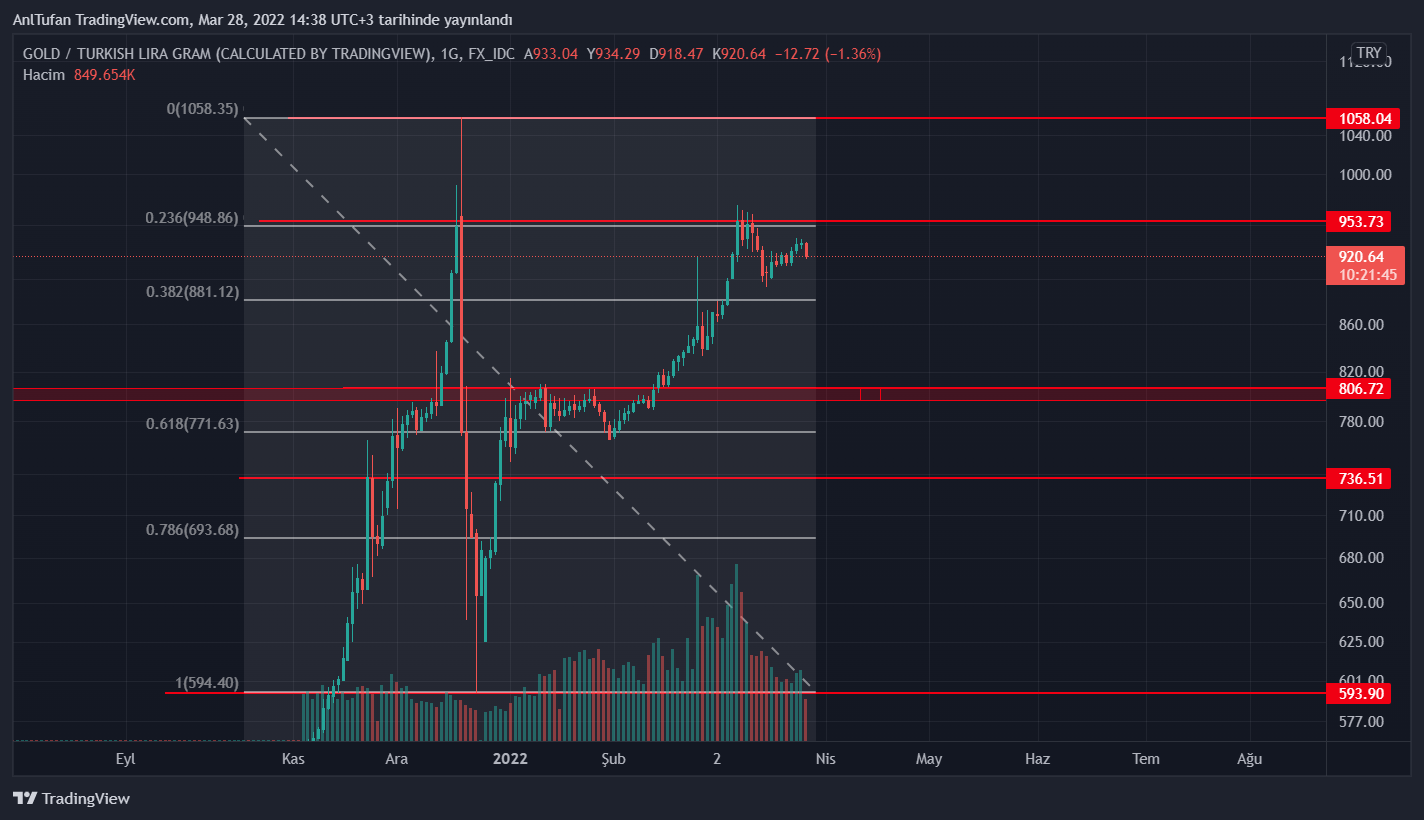 950 Türk lirası direncini aşamamasının ardından düşüşe geçen gram altın, ilerleyen günlerde fibonacci 0.382 seviyesi olan 880 Türk lirası bölgesine kadar bir geri çekilme yaşayabilir.