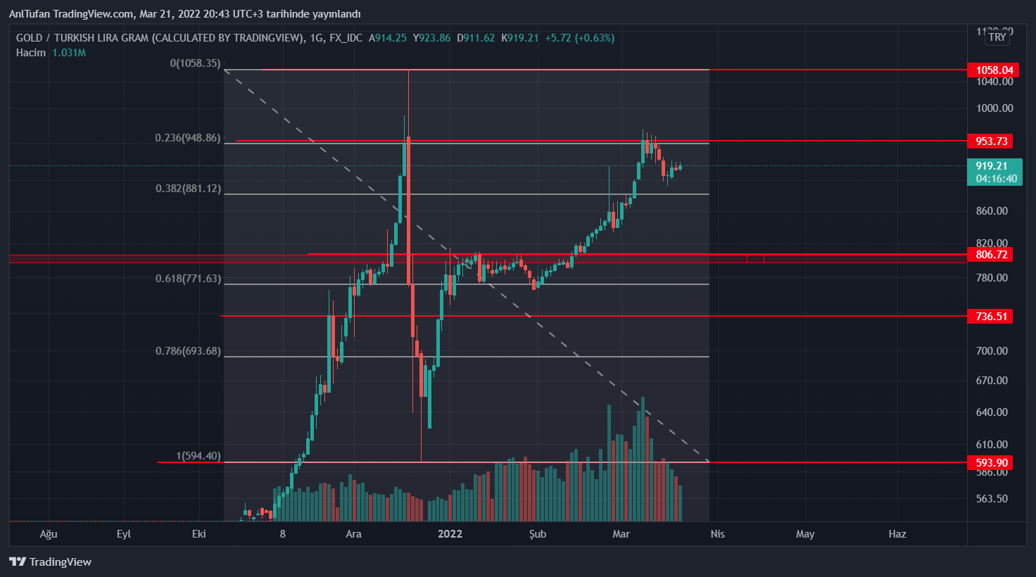 950 Türk lirasının yukarı yönlü kırılması halinde 1050 Türk lirasına kadar yükselmesi beklenen gram altın, 880 Türk lirasını kaybetmesi halinde ise 800 Türk lirasına kadar değer kaybı yaşayabilir.