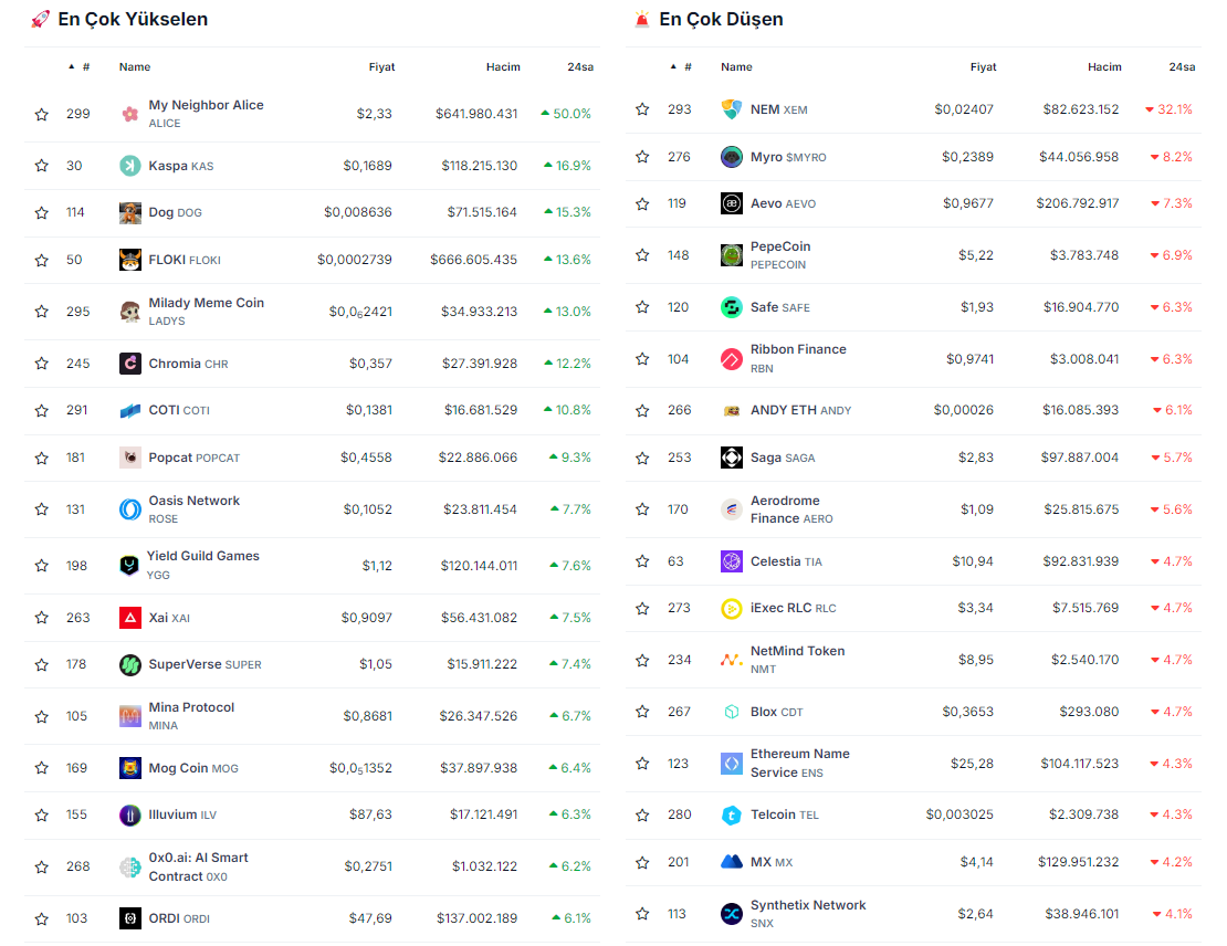Bugünün en çok düşüş yaşayan altcoin’leri ise XEM (Binance‘den delist edildi), MYRO, AEVO, PEPECOIN ve SAFE oldu.