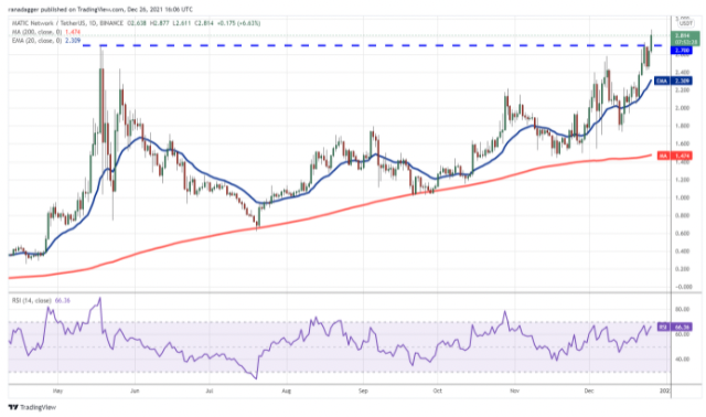 MATIC, yükseliş trendini devam ettirmekte ve 2,70 dolarlık seviyede güçlü bir mücadele veriyor. Tüm zamanların rekorunu kırarak 2,87 dolara ulaşan MATIC, an itibarıyla fiyat keşfi aşamasında.