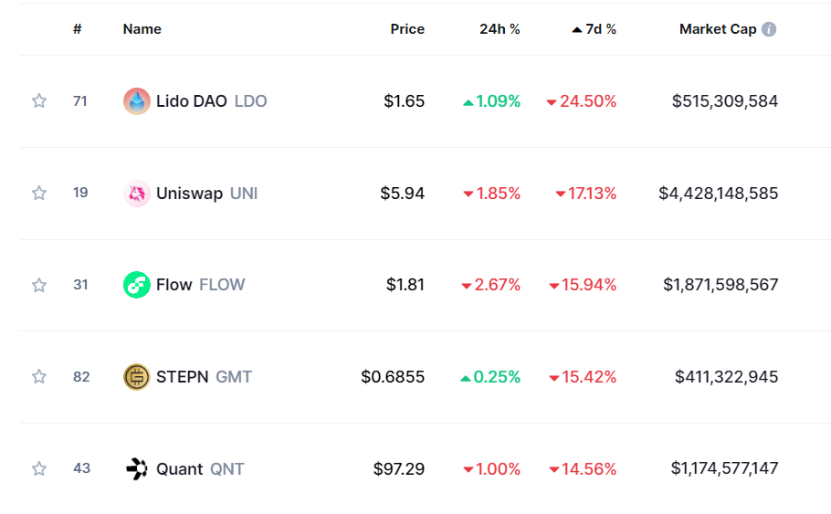 Başarılı bir veri sağlayıcısı olan CoinMarketCap’in aktardıklarına göre ise ilk 100 kripto para birimi içerisinde en çok Lido DAO (LDO) düşüş yaşamış durumda.