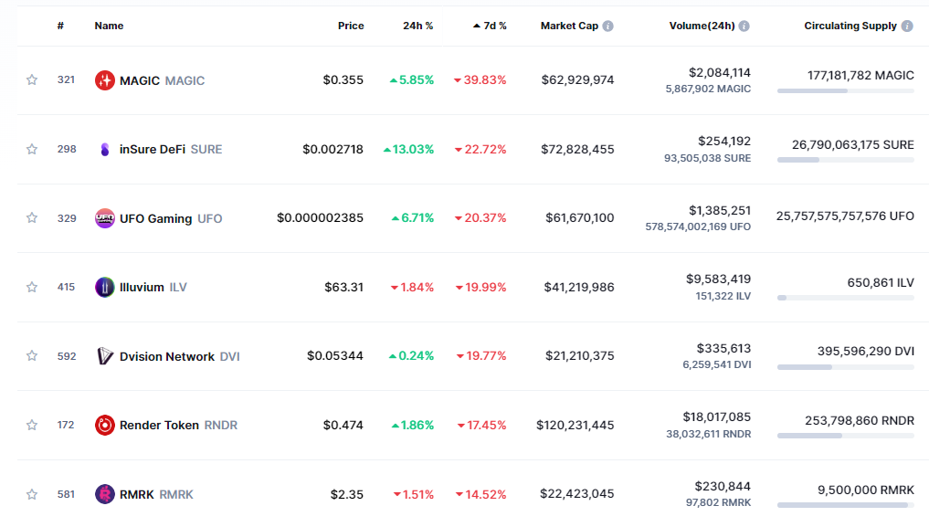 CoinMarketCap’in paylaştığı verilere göre, bu hafta itibariyle aşağıda yer alan metaverse altcoin’leri ciddi miktarda değer kaybetti: