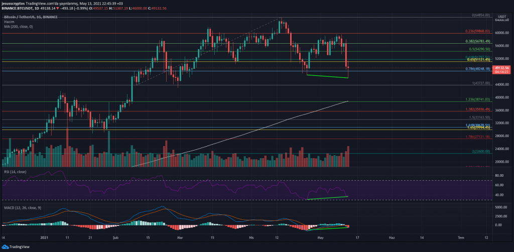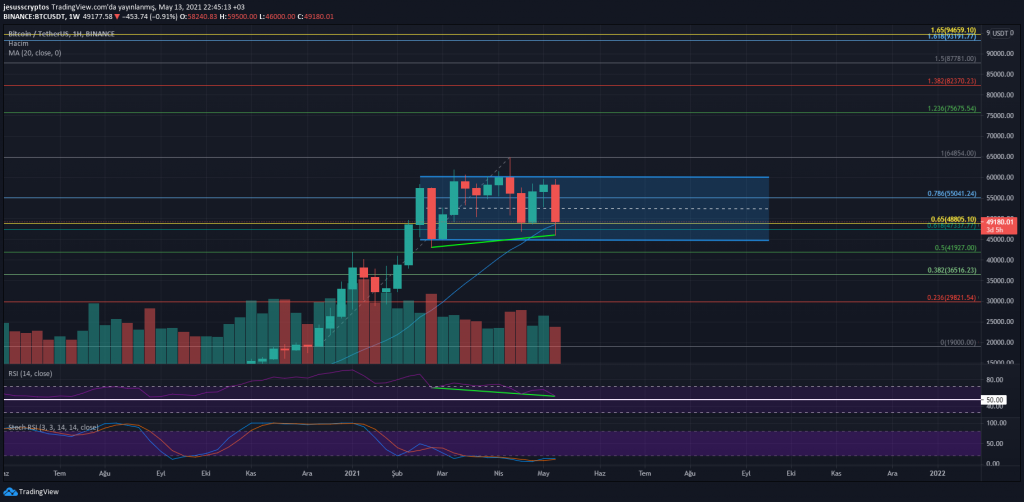 Bir diğer önemli kısım ise 20.000 doların kırıldığı 14 Aralık 2020 haftasından zirve seviyesi olan 64.854 dolara çekilen fibonacci düzeltmesine göre BTC fiyatı için 47.300 – 48.800 dolar aralığının önemli bir destek noktası olduğu görülüyor. Burada haftalık MA20’nin bu aralıkta olması da burayı gerçekten önemli bir hale getiriyor.