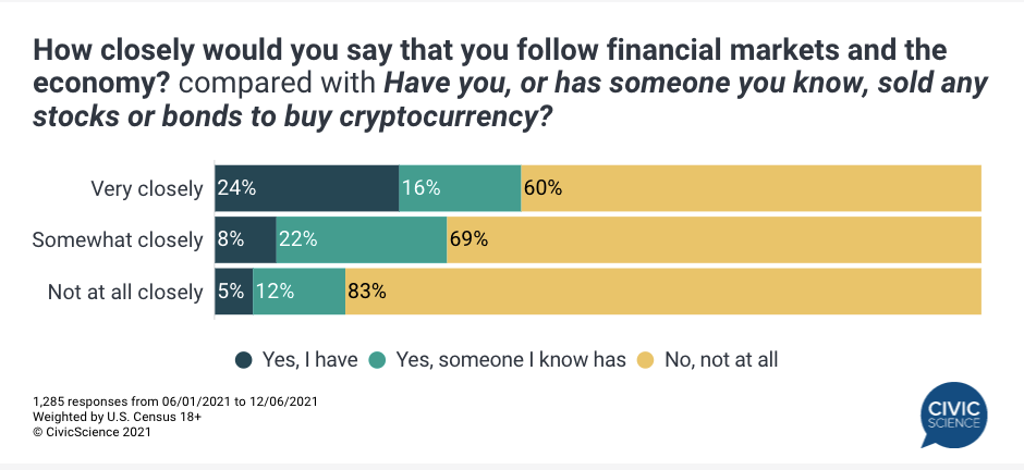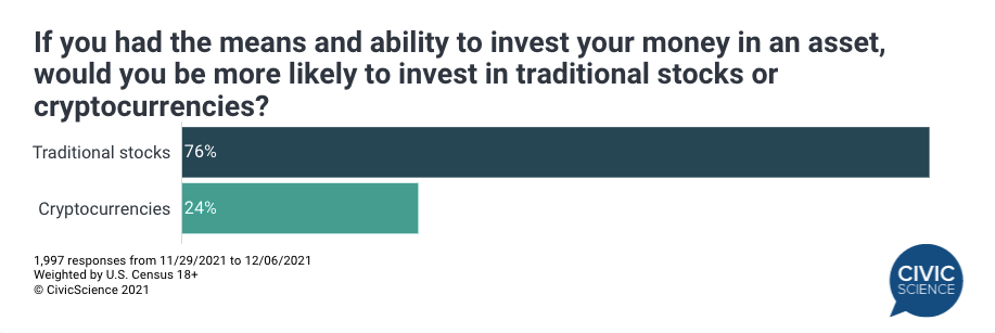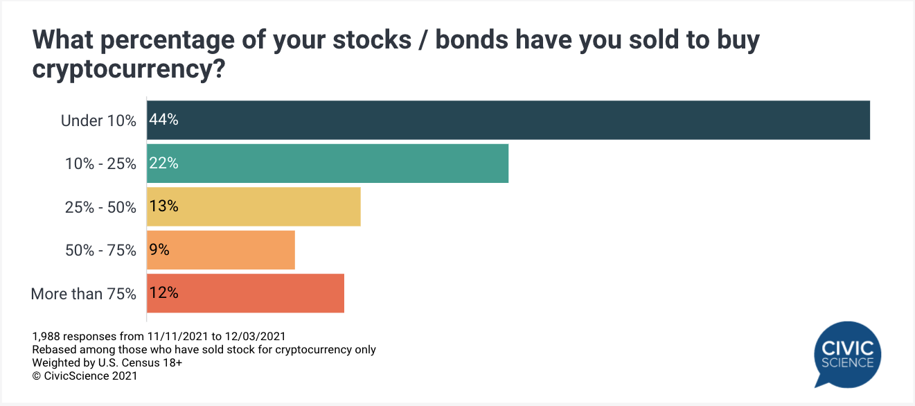 Tüketici verilerini işleme firması olan CivicScience, yaptığı yeni bir araştırmaya göre geleneksel hisse senetlerine kıyasla, paralarını kripto para birimlerine yatırmak istediğini söyleyen kişilerin sayısı sadece 5 ayda %140 arttı. Ayrıca, hisse senetlerinde yatırımı bulunan büyük bir yatırımcı kitlesinin hisse senetlerini satarak kripto varlıklara yatırım yaptığı gözlemlendi.