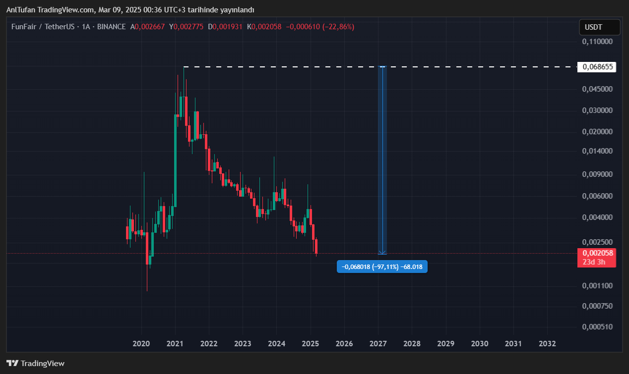 FUN isimli altcoin 2021 boğasında 0.0686 dolara kadar yükselmişti. Son 4 yıl içerisinde yüzde 97’lik bir düşüş yaşayan bu altcoin, an itibariyle 0.00205 dolardan işlem görüyor. FUN bu devasa çöküşe rağmen halen bir yaşam belirtisi göstermiyor.