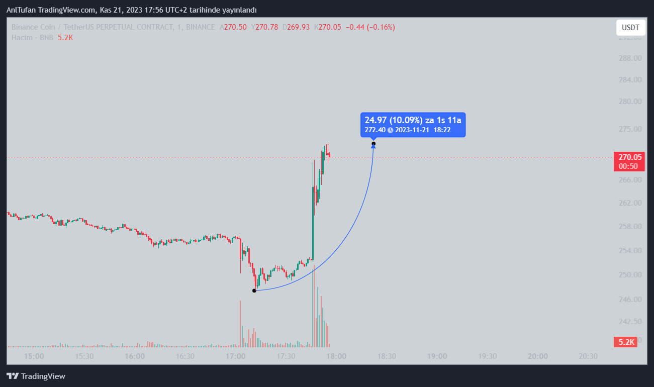 Birçok kripto yatırımcısı son dakikalarda TSİ 23.00’dai DOJ duyurusundan endişelenmiş olsa da, son Binance gelişmeleri BNB’nin sert bir artış yaşamasını sağlarken, Bitcoin’in de yükselişe geçmesini sağladı.