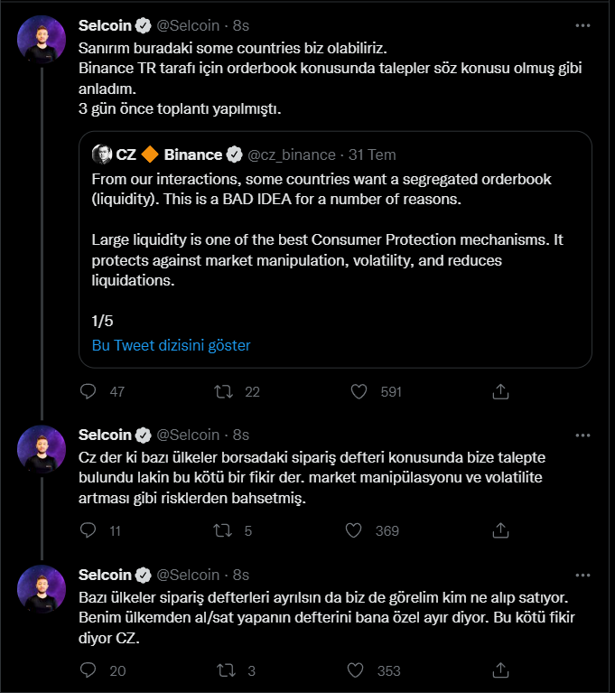 Selcoin’e göre Türkiye, Binance TR üzerinden sadece Türk vatandaşlara özel bir likidite havuzu istiyor olabilir. Binance CEO’su CZ ise şimdilik bu teklife olumsuz bir geri dönüş yapmışa benziyor.