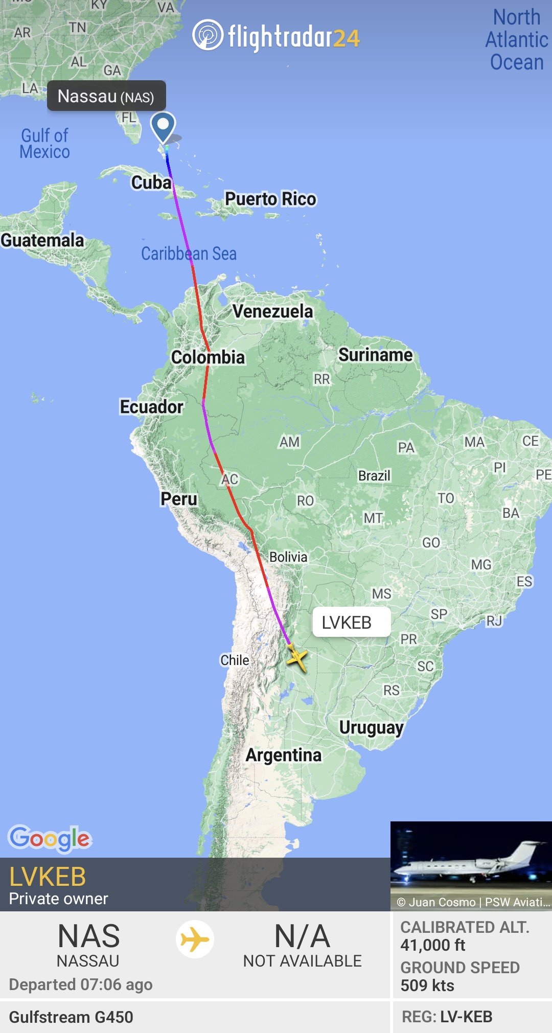 Şuan itibariyle Bahamalardan kalkan uçağın ilk etapta Kolombiya‘ya ulaştığı görülebilmekte. Son paylaşılan söylentilere göre ise uçak Arjantin‘e hareket etmeye devam etmekte.