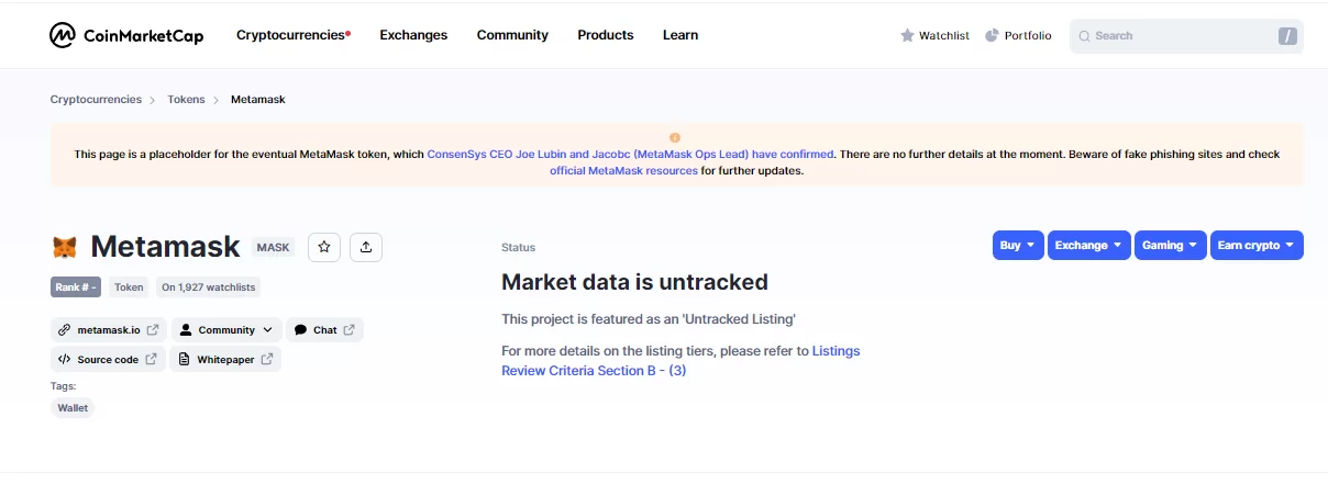 CoinMarketCap, Metamask’ın CMC sayfasına şu bilgiyi yerleştirdi: