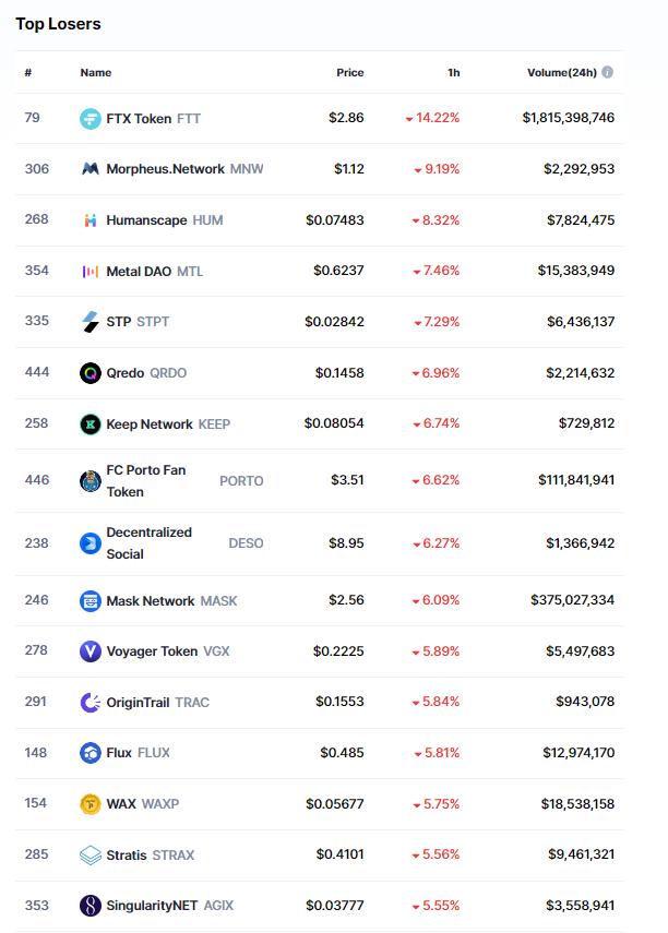 Başarılı bir veri sağlayıcısı olan CoinMarketCap’in aktardıklarına göre, son 1 saat içerisinde en fazla düşüş yaşayan ürün FTX Token (FTT) oldu.
