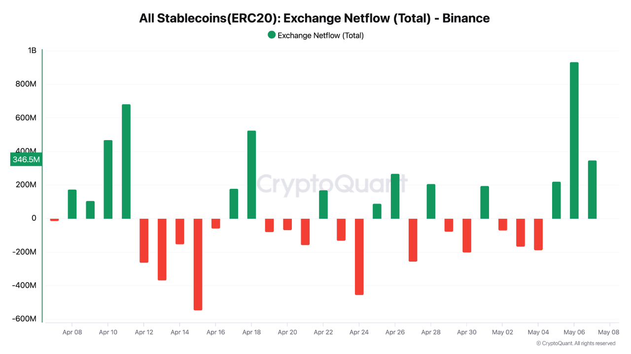 “Son üç gün içinde Binance’e yapılan stablecoin transferleri önemli ölçüde arttı. Özellikle 6 Mayıs (Bitcoin’in 93.400 dolarda dip yaptığı gün), Nisan ayından bu yana görülen en büyük günlük giriş olarak öne çıkıyor – toplam giriş yaklaşık 1 milyar dolar.