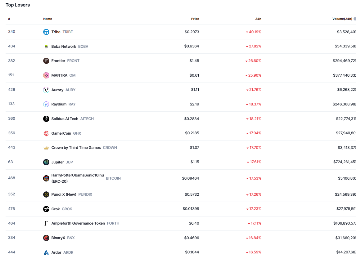 Başarılı bir veri sağlayıcısı olan CoinMarketCap’in aktardığı bilgilere göre ilk 500 kripto para birimi içerisinde son 24 saat özelinde en fazla düşüş yaşayan altcoin Tribe (TRIBE) oldu.