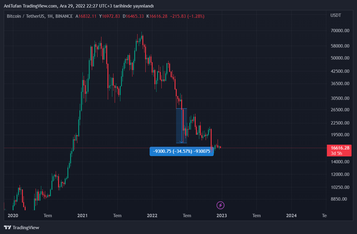 Lider kripto para birimi 2022 yılı özelinde toplamda yüzde 64’lük bir düşüş yaşamış durumda. Her ne kadar BTC zirve seviyesinden yüzde 75 geride olsa da, Bitcoin’in zirveye 2021 yılının Kasım ayında ulaştığını unutmamak gerek.