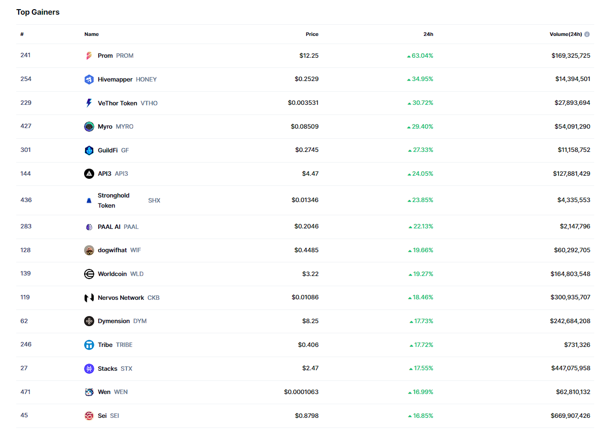 Bugün itibariyle DWF Labs kurucusunun yatırımlarıyla birlikte %63’lük bir artış yaşayan PROM, dikkatleri üzerine çekti. PROM haricinde aşağıdaki altcoin’lerde kayda değer yükselişler yaşadı: