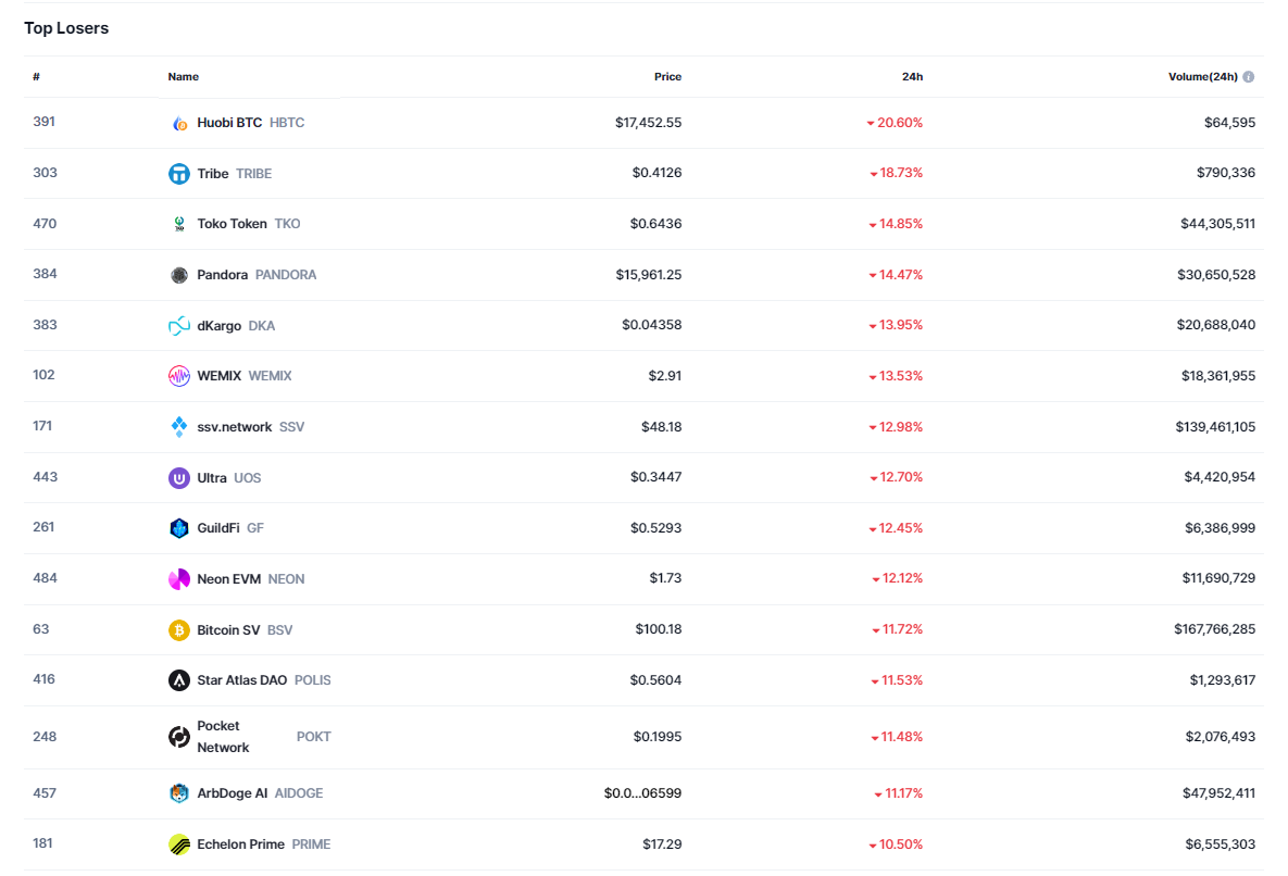 Başarılı bir veri sağlayıcısı olan CoinMarketCap’in aktardığı bilgilere göre ilk 500 kripto para birimi içerisinde son 24 saat özelinde en fazla düşüş yaşayan altcoin Huobi BTC (HBTC) oldu.