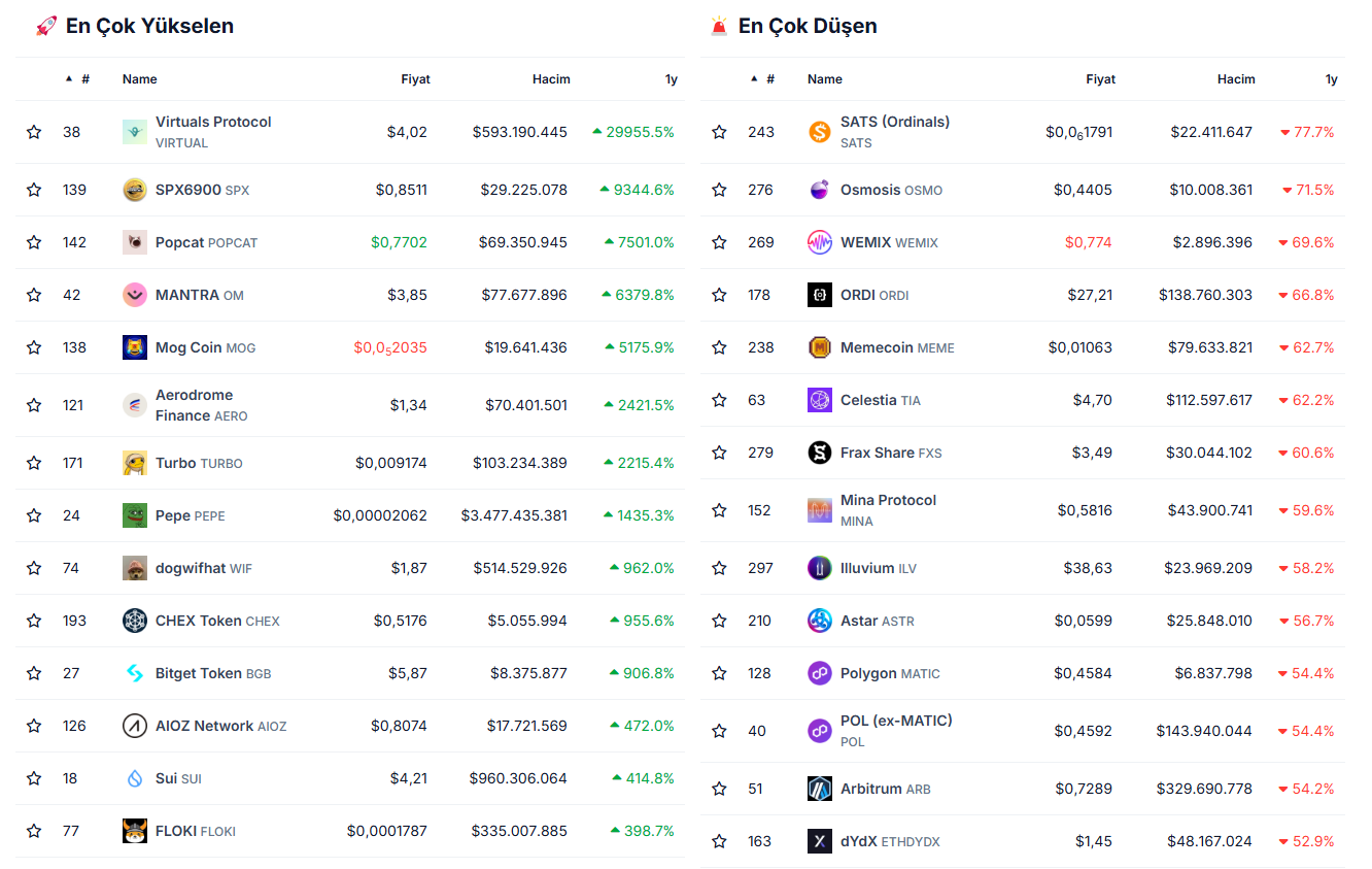 CoinGecko’nun paylaştığı verilere göre ilk 300 kripto para birimi içerisinde bu yıl özelinde en çok artışı yeni çıkan bir altcoin olan VIRTUAL gerçekleştirdi. VIRTUAL ilk çıkışı ile birlikte bu yıl %29955’lik bir artış yaşadı.
