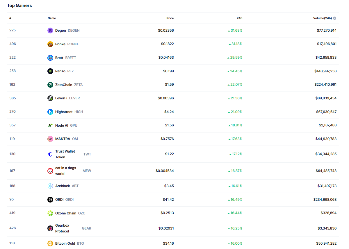 DEGEN bugün özelinde %31 oranında değer kazanırken, PONKE, BRETT, REZ, ZETA, LEVER ve HIGH‘ın ise %20’den fazla yükseliş yaşadığı gözlemlendi.