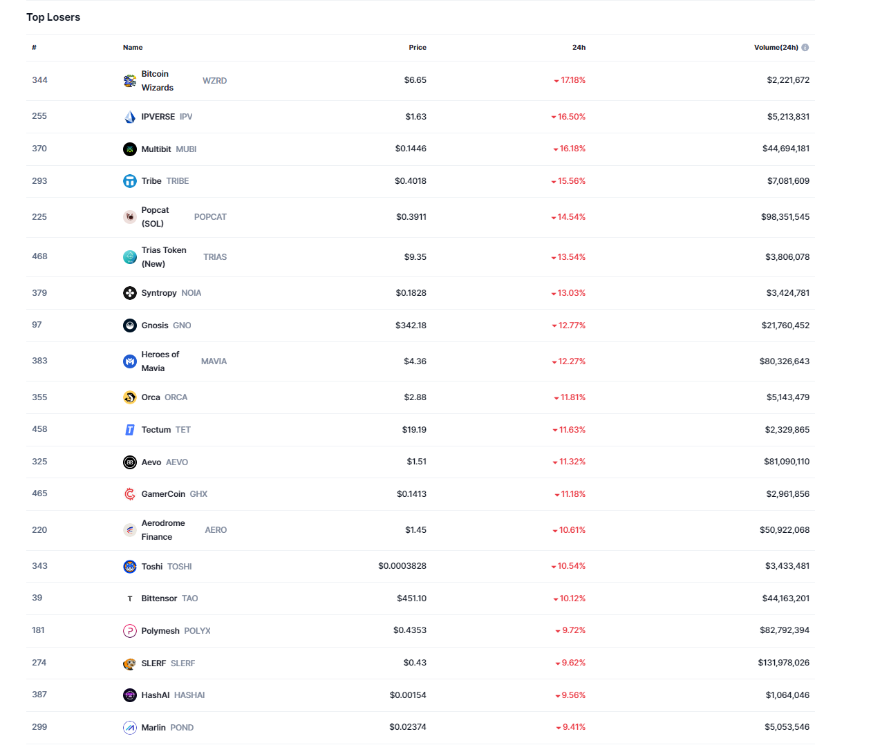 WZRD son 24 saat içerisinde %17 oranında değer kaybederken, IPV, MUBI, TIBE, POPCAT ve TRIAS isimli altcoin’lerin de ciddi miktarda düşüş yaşadıkları gözlemlendi.