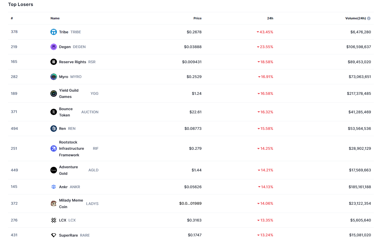 Başarılı bir veri sağlayıcısı olan CoinMarketCap’in aktardığı bilgilere göre bugün ilk 500 kripto para birimi içerisinde en çok düşüş yaşayan altcoin Tribe (TRIBE) oldu.