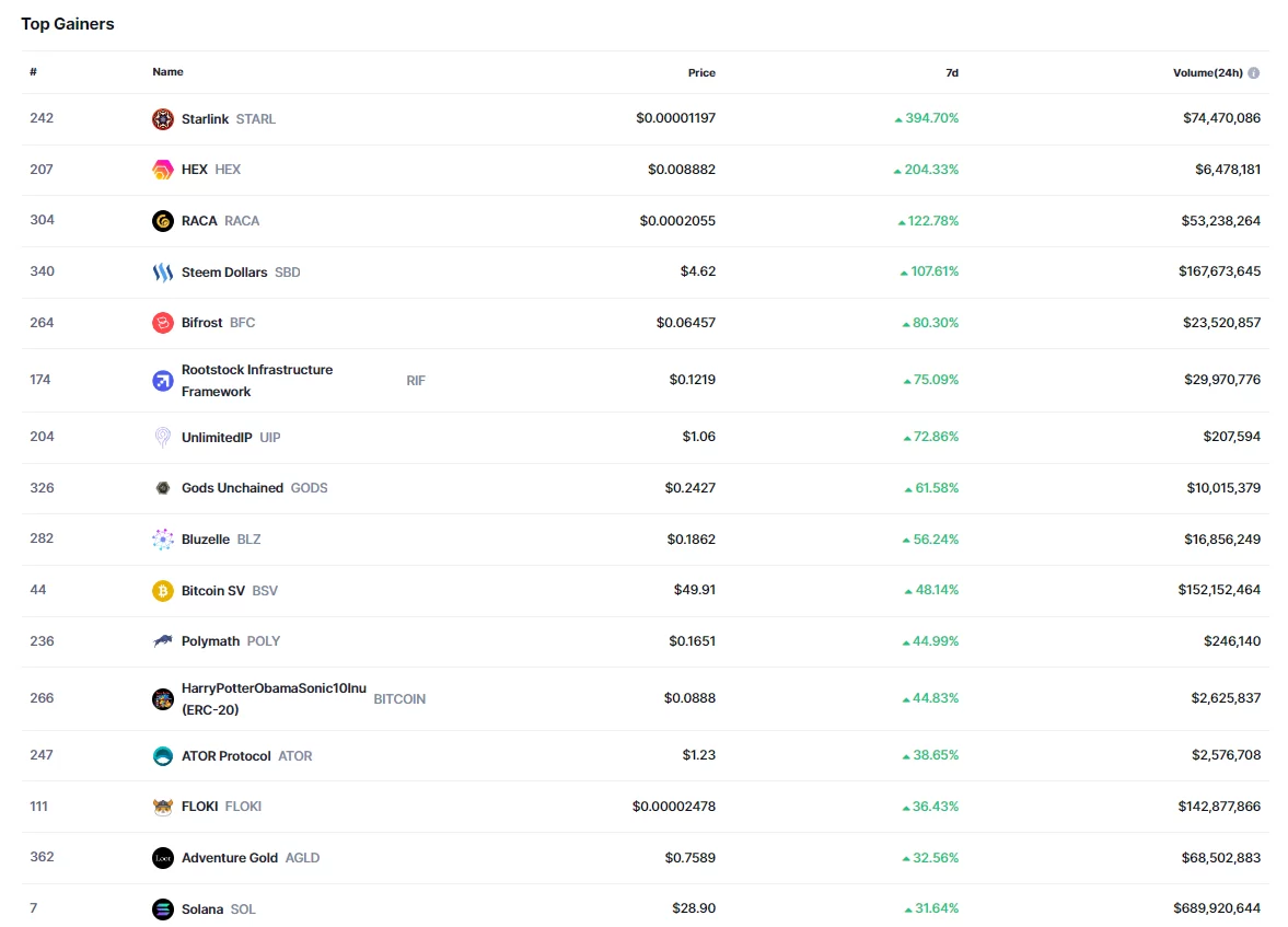 CoinMarketCap verilerine göre STARL haricinde HEX, RACA, SBD, BFC ve RIF‘ın da çok ciddi miktar değer kazandıkları görülüyor. Özellikle RACA’nın artışları, Türk kripto yatırımcılarını çok sevindirdi.