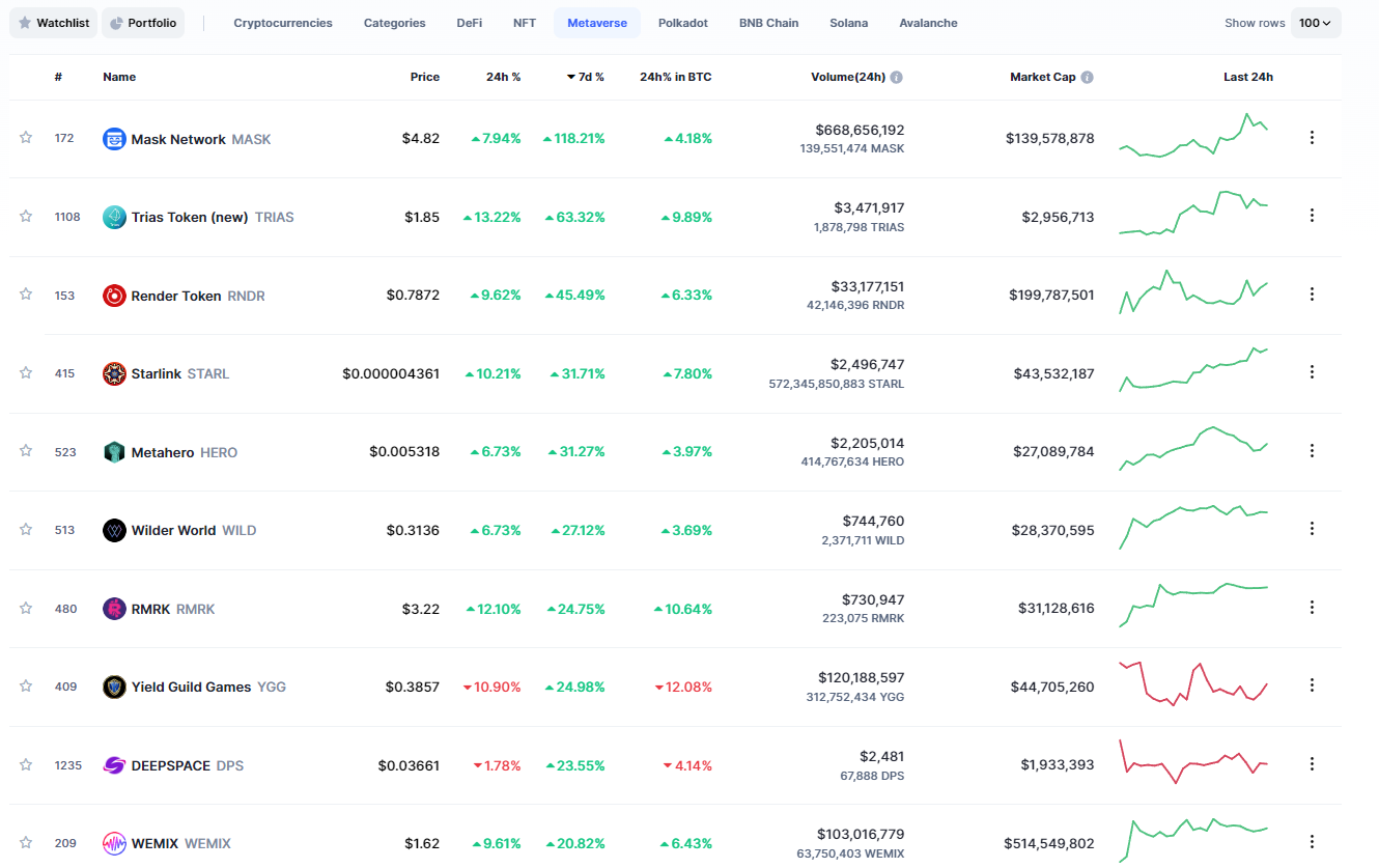 Kripto para sektörünün en büyük veri sağlayıcısı olan CoinMarketCap’in aktardıklarına göre, aşağıdaki altcoin’ler metaverse kategorisinde yer alıyor. Bizde siz okurlarımız için bu hafta metaverse kategorisinde olup yüzde 20’den fazla yükseliş yaşayan altcoin’leri derledik: