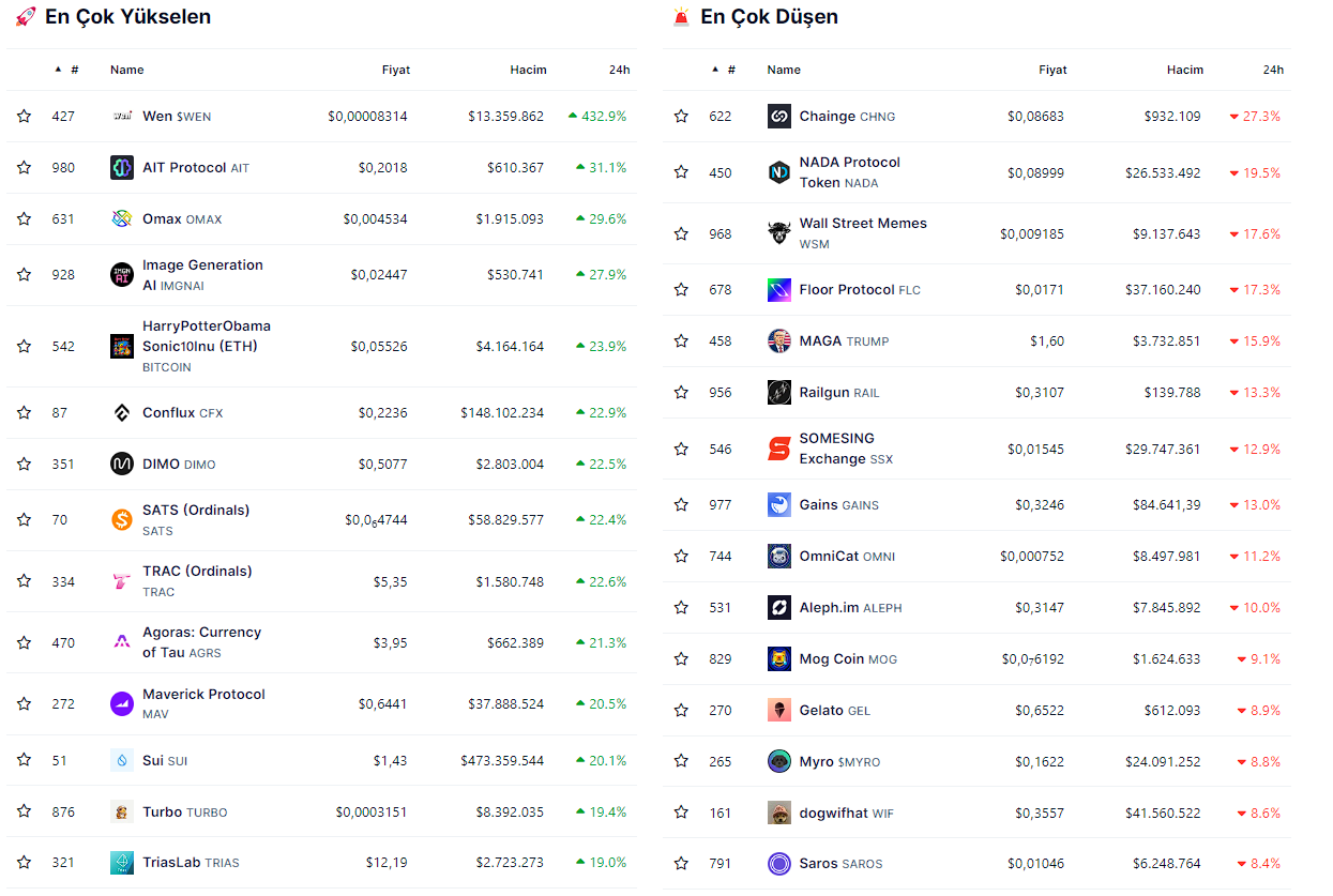 İşte Bugünün En Çok Artan ve Düşen Altcoin’leri!