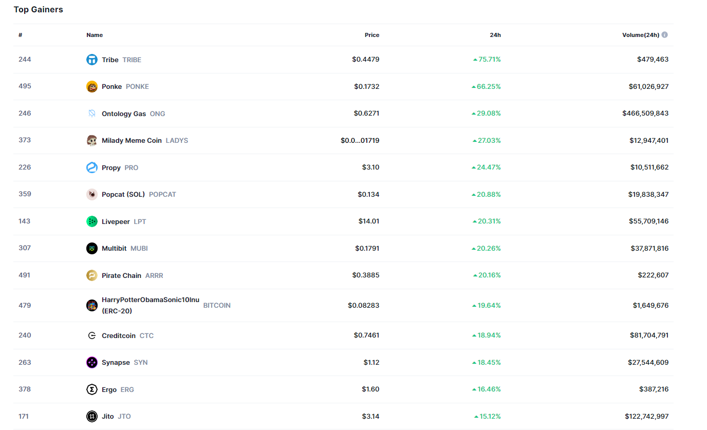 TRIBE ve PONKE haricinde hiçbir altcoin %50’den fazla değer kazanamazken, ONG, LADYS, PRO, POPCAT, LPT, MUBI ve ARRR isimli altcoin’ler %20’den fazla yükseliş yaşadı.