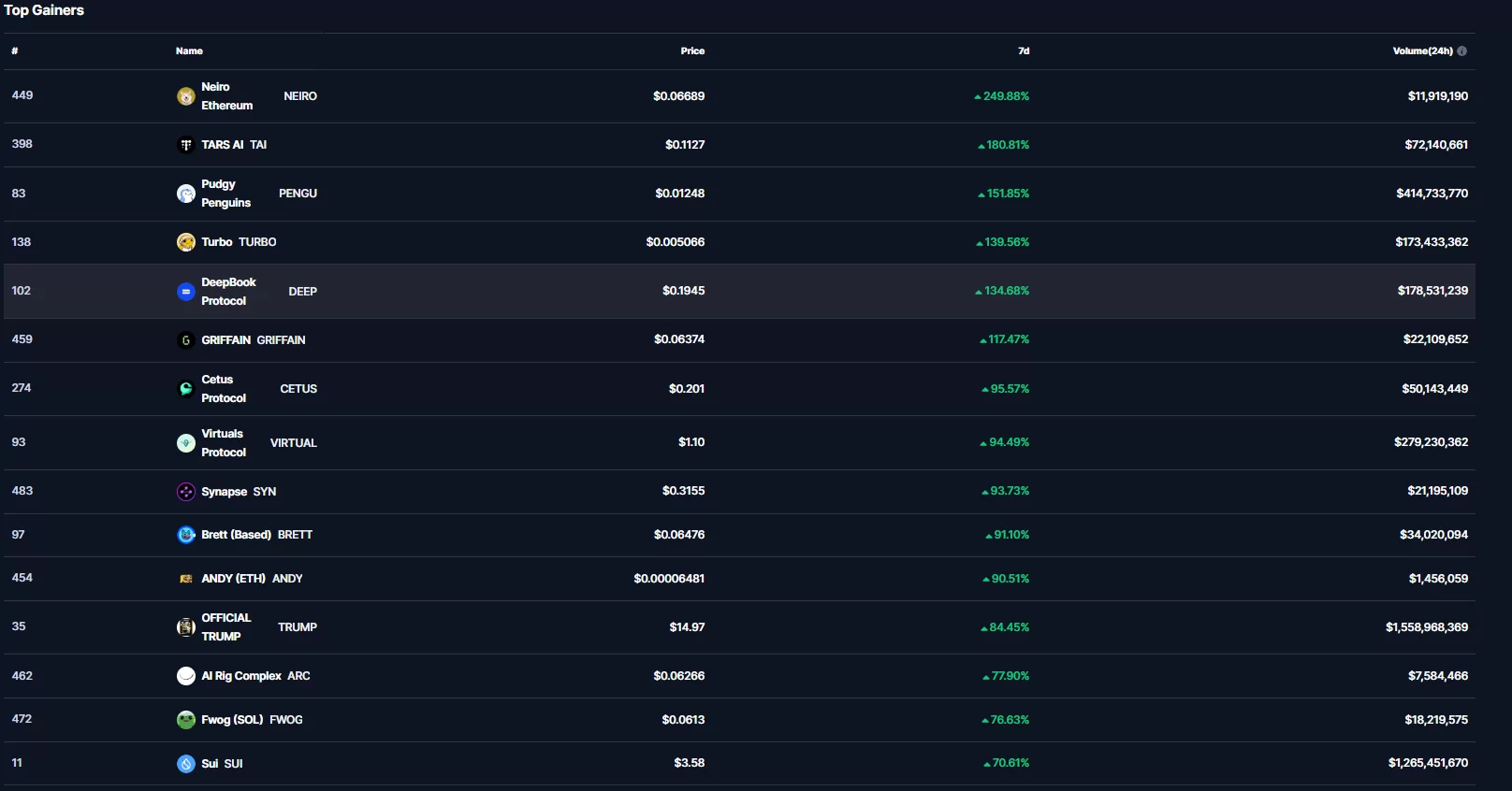 Başarılı veri sağlayıcısı CoinMarketCap’in aktardıklarına göre ilk 500 kripto para birimi içerisinde son 7 gün özelinde en çok artışı %250 ile birlikte NEIRO isimli altcoin gerçekleştirdi.