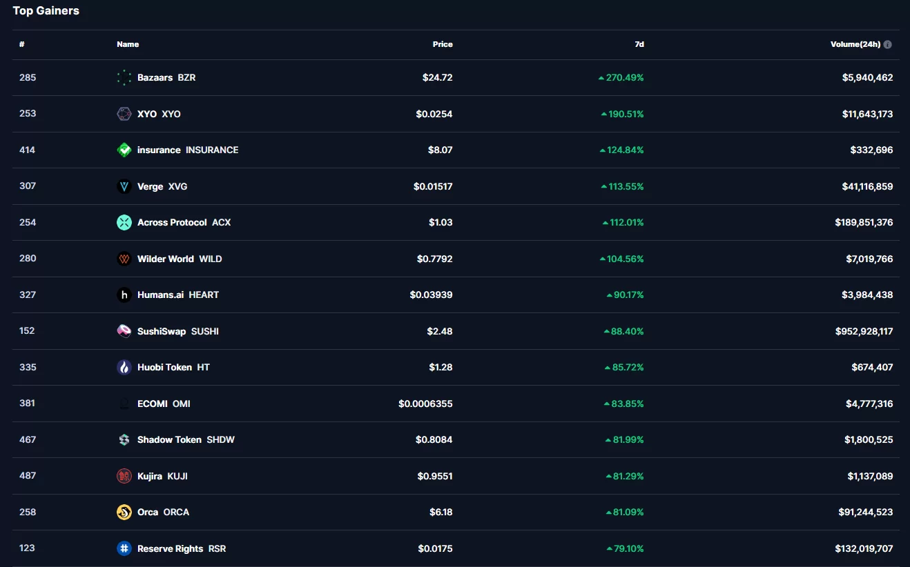 Başarılı veri sağlayıcısı CoinMarketCap’in aktardığı bilgilere göre son 7 gün özelinde ilk 500 kripto para birimi içerisinde en çok yükselişi %270 ile birlikte BZR isimli altcoin gerçekleştirdi.
