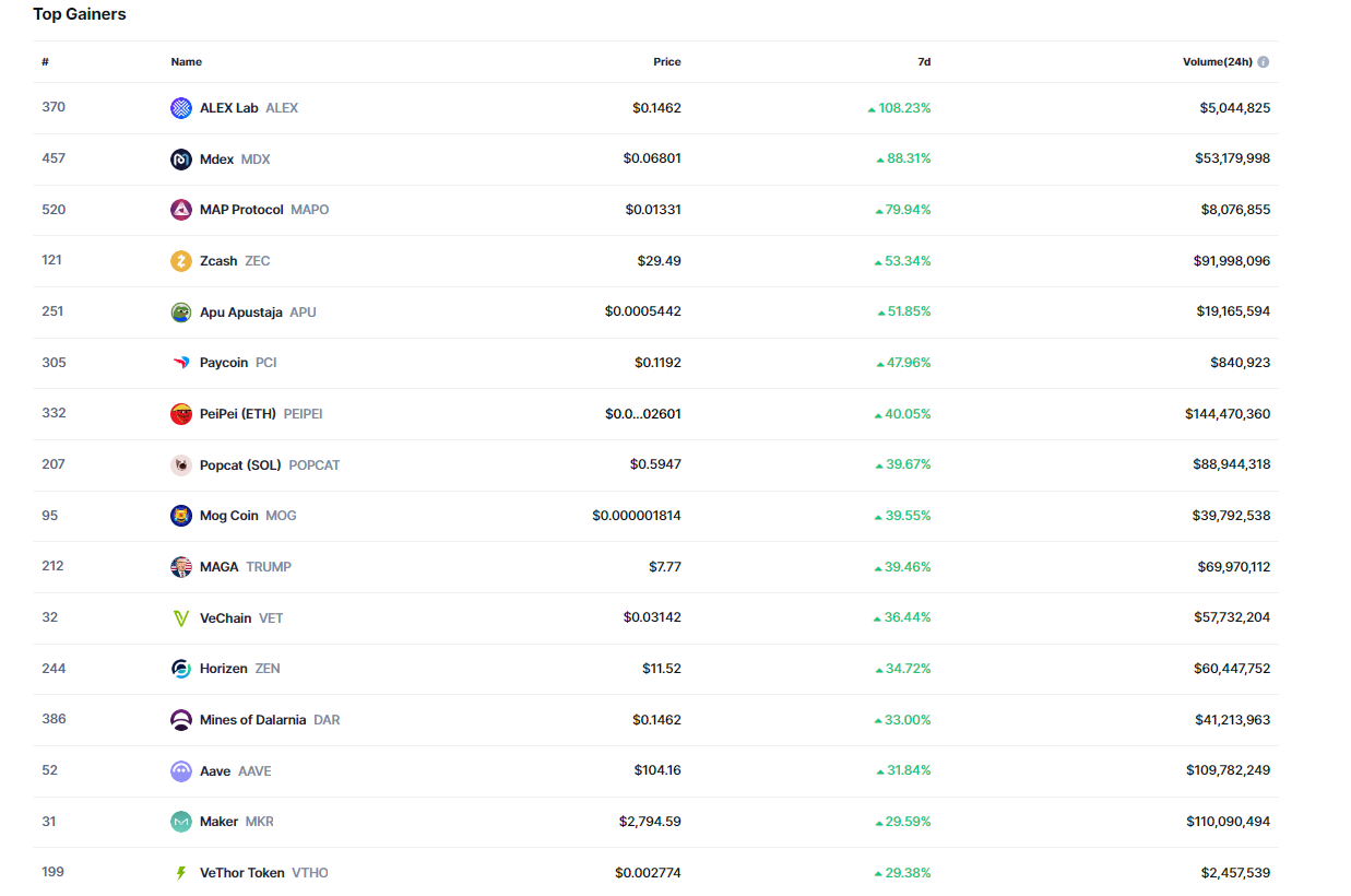 Başarılı veri sağlayıcısı CoinMarketCap’in aktardığı bilgilere göre son 7 gün özelinde ilk 500 kripto para birimi içerisinde en çok yükselişi %108 ile birlikte ALEX isimli altcoin gerçekleştirdi.
