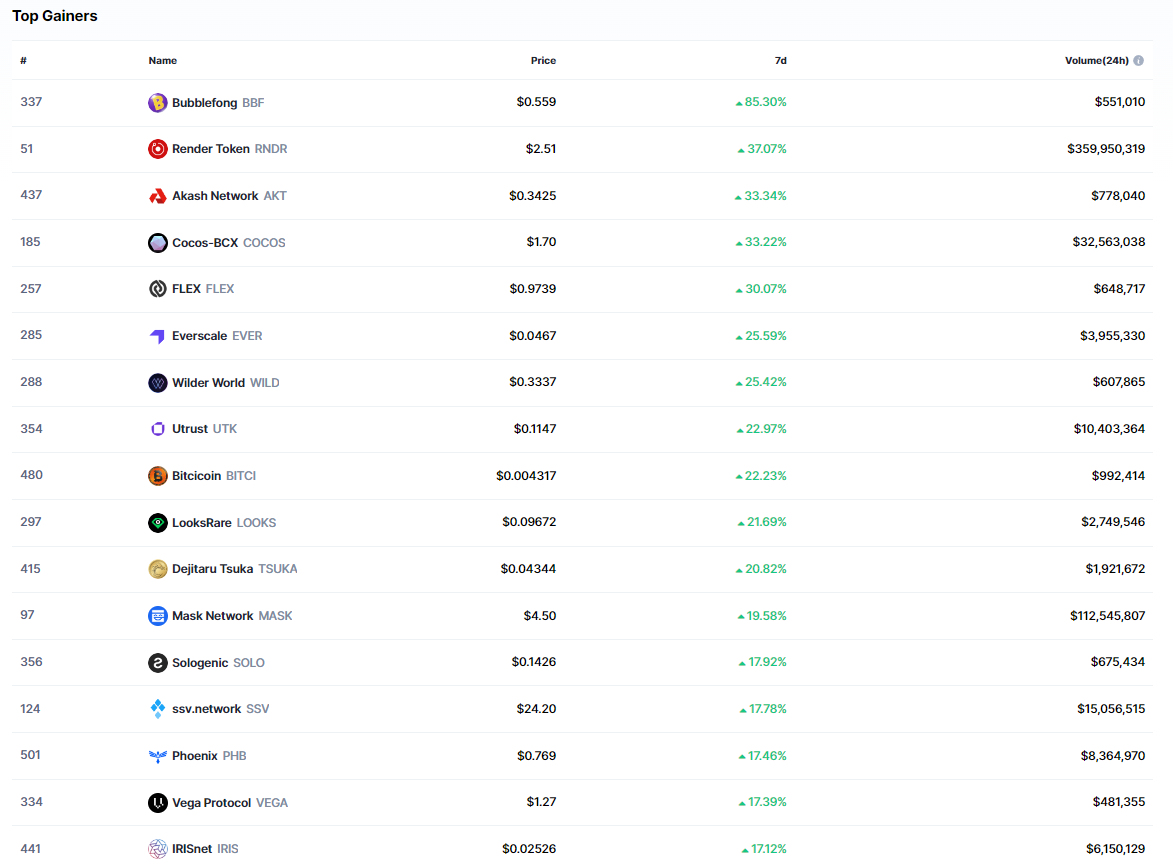 Başarılı bir veri sağlayıcısı olan CoinMarketCap’in aktardıklarına göre bu hafta özelinde ilk 500 kripto para birimi içerisinde en büyük yükselişi Bubblefong (BBF) isimli altcoin yaşadı.