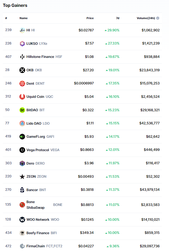 Başarılı bir veri sağlayıcısı olan CoinMarketCap’in aktardıklarına göre, son 1 hafta içerisinde ilk 500 kripto para birimi içerisinde HI (HI) isimli altcoin ciddi yükselişler gerçekleştirdi.
