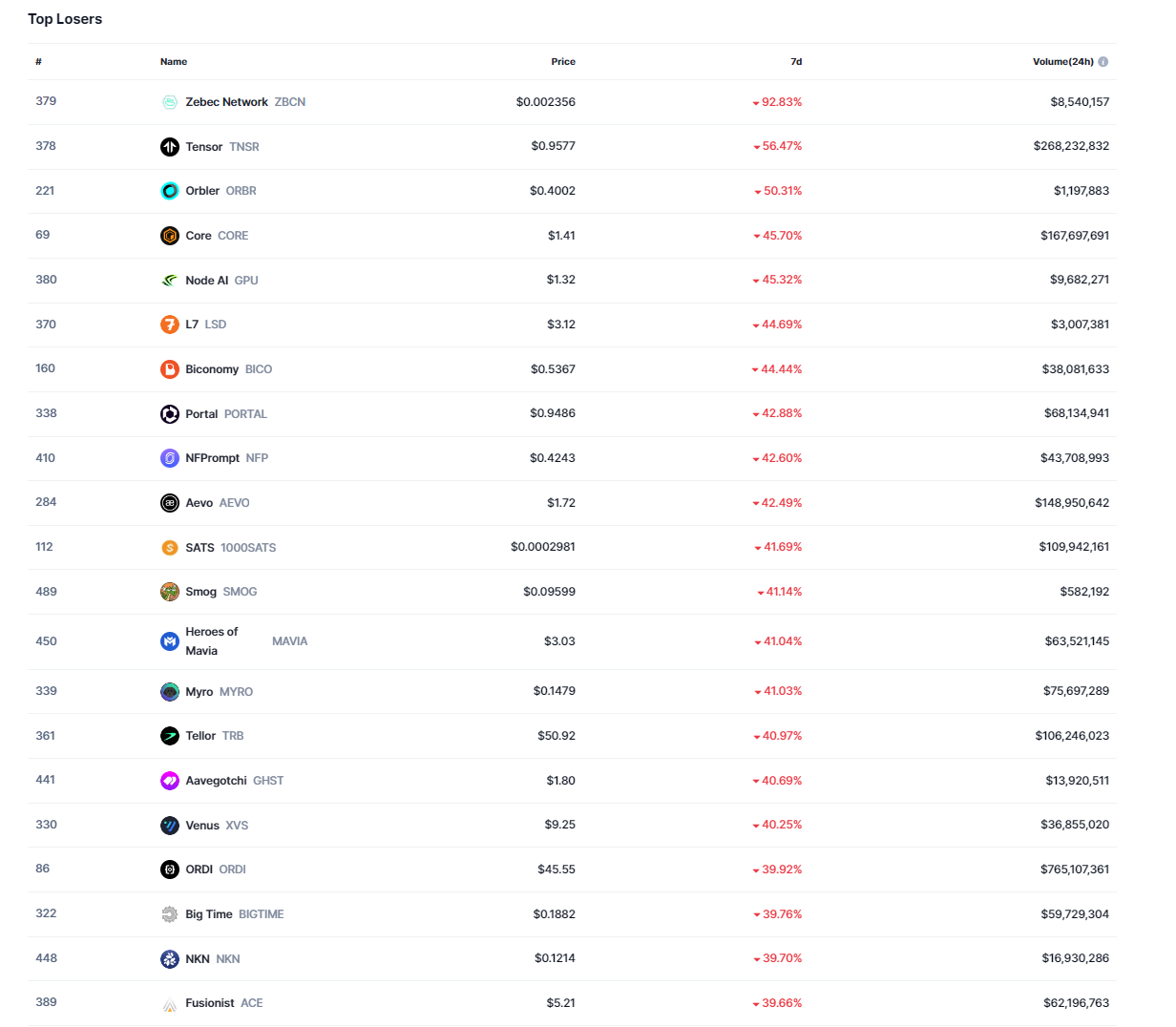 Bu hafta birçok altcoin çöküş yaşadı. ZBCN haricinde en büyük düşüşleri ise TNSR, ORBR, CORE, GPU ve LSD gerçekleştirdi.