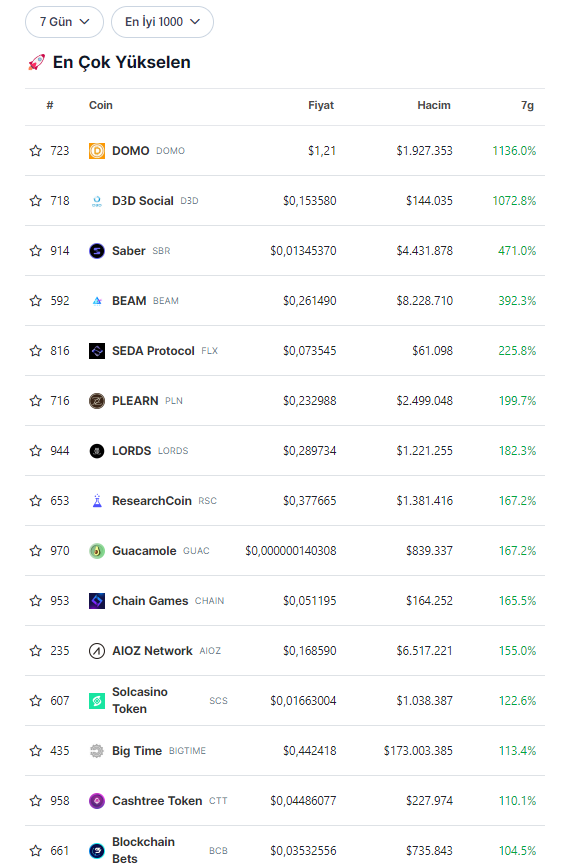 Başarılı bir veri sağlayıcısı olan CoinGecko’nun paylaştığı bilgilere göre ilk 1.000 kripto para birimi içerisinde bu haftanın en çok yükselen ürünü DOMO oldu.