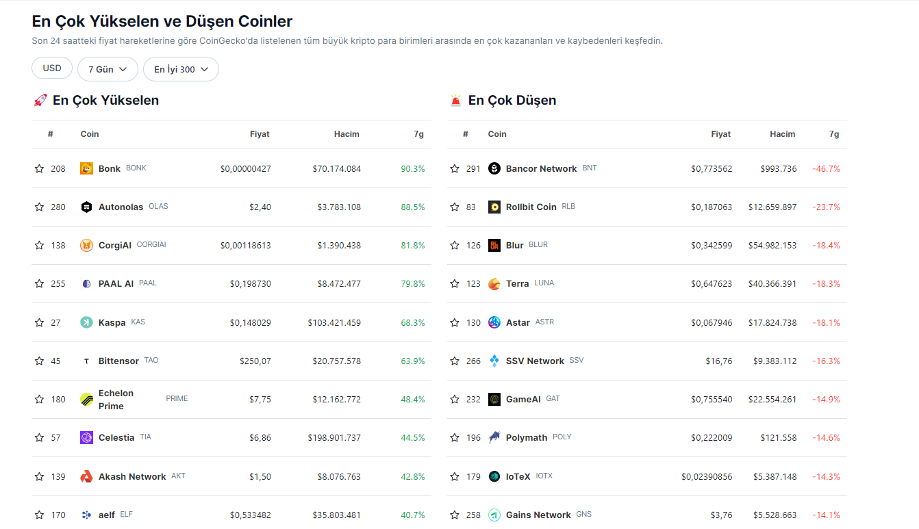 Başarılı bir veri sağlayıcısı olan CoinGecko’nun paylaştığı bilgilere göre piyasa değerine göre ilk 300 kripto para birimi içerisinde bu hafta en çok yükselen ürün BONK oldu.