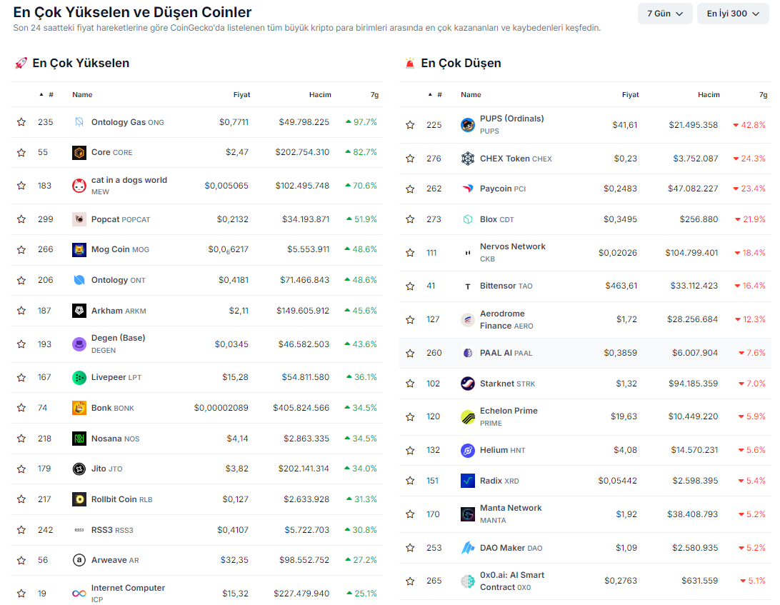 - Bu hafta ONG haricinde CORE, MEW, POPCAT, MOG ve ONT isimli altcoin’lerde kayda değer artışlar yaşadı.