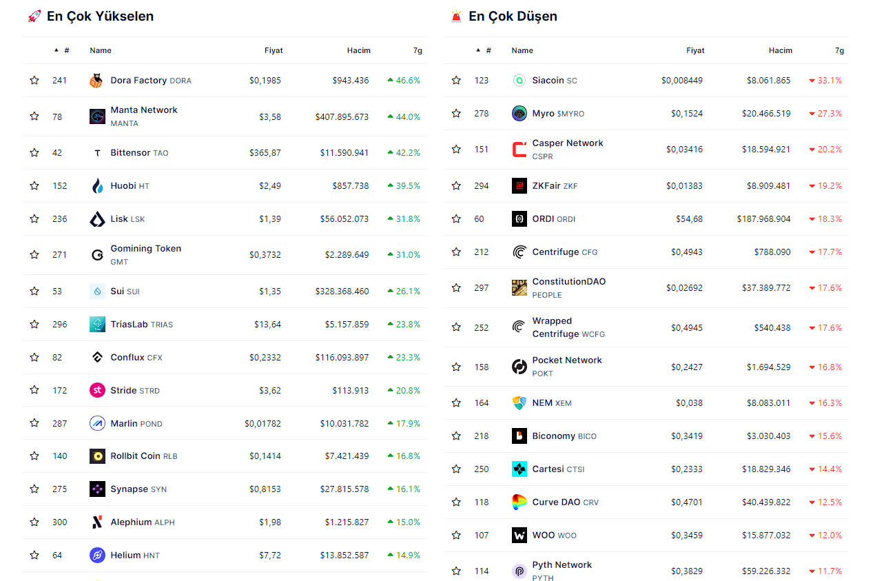 Bu haftanın en çok düşüş yaşayan ürünleri ise SC, MYRO, CSPR, ZKF ve ORDI oldu.