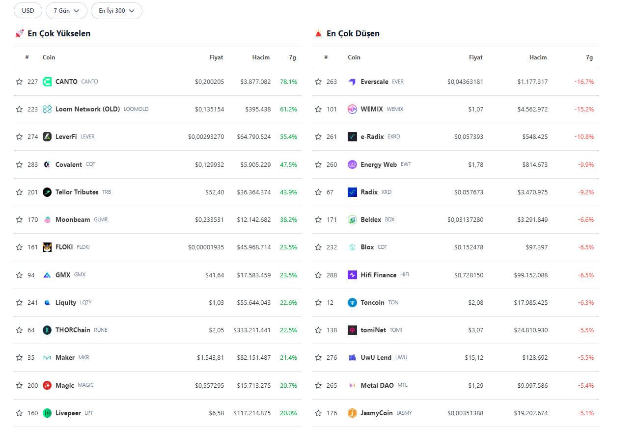 Hadi gelin bu haftanın en çok artan ve düşen altcoin’lerine birlikte göz atalım: