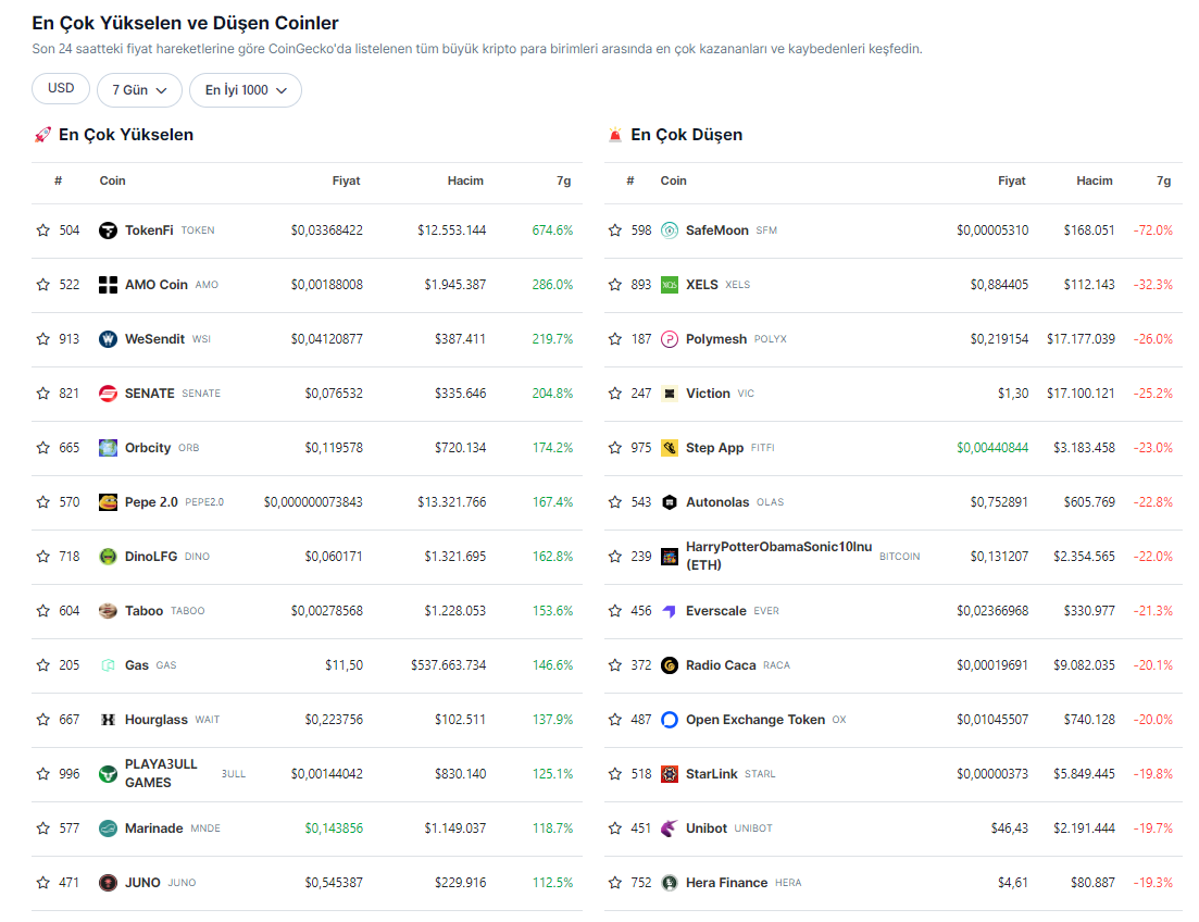 Başarılı bir veri sağlayıcısı olan CoinGecko’nun aktardığı bilgilere göre piyasa değerine göre ilk 1.000 kripto varlık içerisinde bu hafta itibariyle birçok altcoin %100’den fazla değer kazanmayı başardı.