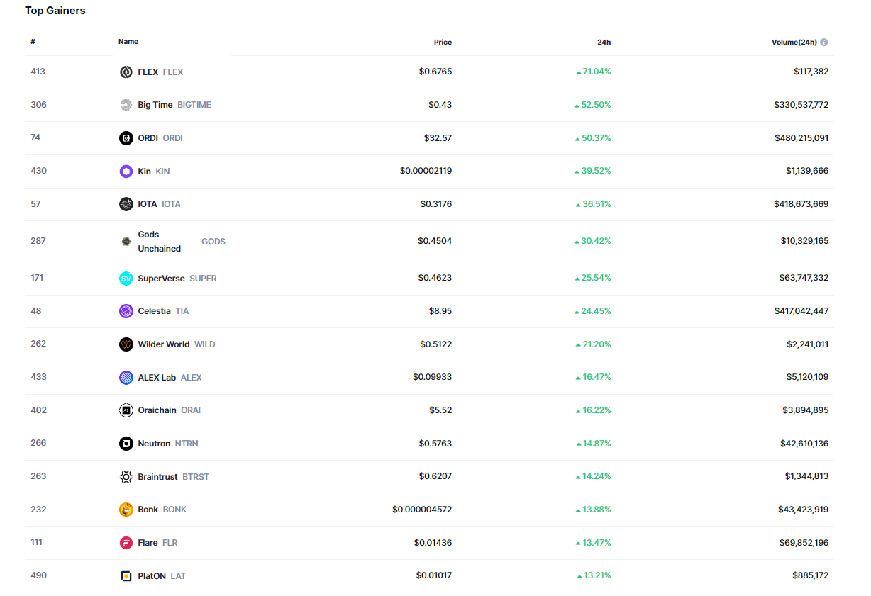 FLEX son 24 saat içerisinde %71’lik bir artış yaşayarak dikkatleri üzerine çekti. FLEX’in haricinde aşağıdaki altcoin’lerde %30’dan fazla yükseliş yaşamayı başardı: