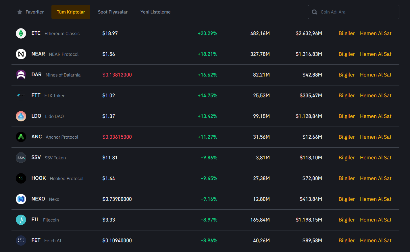 ETC’nin ardından sonra NEAR, DAR, LDO ve ANC gibi ürünler gelmekte. Bu altcoin’lerin de bugün itibariyle yüzde 10’dan fazla değer kazanması yatırımcıların dikkatini çekti.