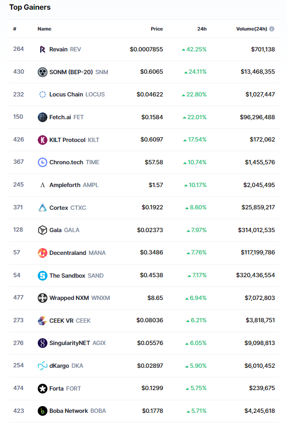 Başarılı bir veri sağlayıcısı olan CoinMarketCap’in aktardıklarına göre, ilk 500 kripto para birimi içerisinde bugün itibariyle en fazla yükseliş yaşayan ürün Revain (REV) oldu.