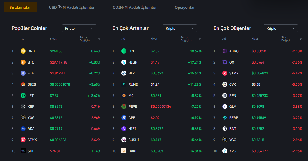 Hadi gelin Binance’deki altcoin‘lerin son durumuna birlikte göz atalım: