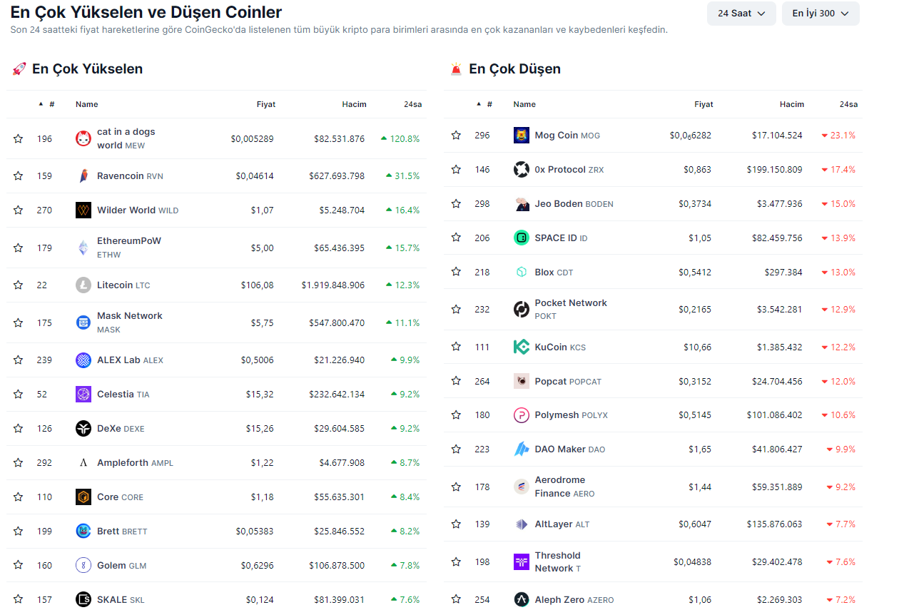 Başarılı bir veri sağlayıcısı olan CoinGecko’nun paylaştığı bilgilere göre ilk 300 kripto para birimi içerisinde en çok yükselen altcoin Cat in Dogs World (MEW) oldu. MEW isimli meme coin bugün %120 oranında değer kazandı.