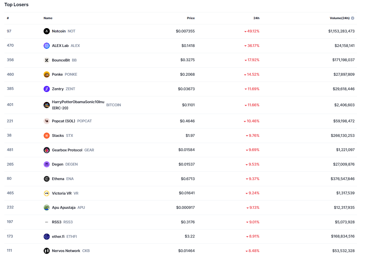 Başarılı bir veri sağlayıcısı olan CoinMarketCap’in aktardığı bilgilere göre ilk 500 kripto para birimi içerisinde en çok düşen altcoin ALEX Lab (ALEX) olduğu gözlemlendi. Her ne kadar listenin başında NOT yer alsa da, Notcoin’in bugün çıktığı için ilk sırada yer aldığı görülüyor.