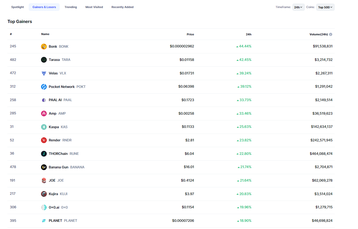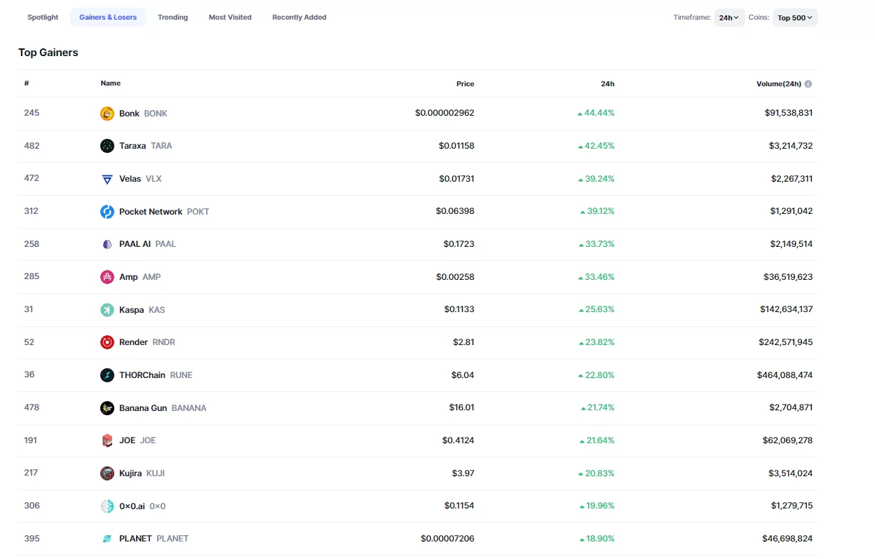 Başarılı bir veri sağlayıcısı olan CoinMarketCap’in aktardığı bilgilere göre son 24 saat özelinde piyasa değerine göre ilk 500 kripto para birimi içerisinde en büyük yükselişi BONK isimli şaka tokeni gerçekleştirdi.
